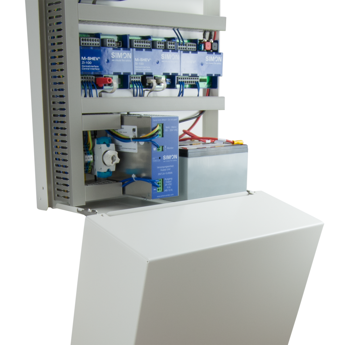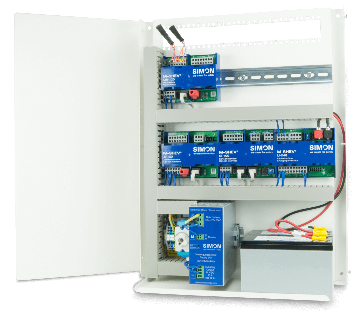 The M-SHEV as a digital modular control panel for SHEV and ventilation systems has been one of the technology leaders in the market for years. Divided into two parts, the power supply and the control section, it has a very wide range of functions, which leaves nothing to be desired in terms of modern and flexible smoke extraction concepts. With regard to the energy supply according to EN 12101-10, the previous focus was on 24 A cascading, which we are now allowed to extend with a further switching power supply unit. We are replacing the previous 10 A unit with a newly developed compact 12 A switching power supply based on the latest technology - recognisable by the name M-SHEV-12 for the modular control panels. The switching power supply has a compact design with 10 A continuous and 12 A short-term operation. Together with the also new charging interface LI-048, the complete power supply EV-12 is tested according to EN 12101-10. The switching power supply unit SNT is used in the M-SHEV modular control panels as well as the M-SHEV-12-AP and M-SHEV-12-AP-eco. It enables the maximum utilization of an MR-120 module with up to 12 A total current in one actuator line.