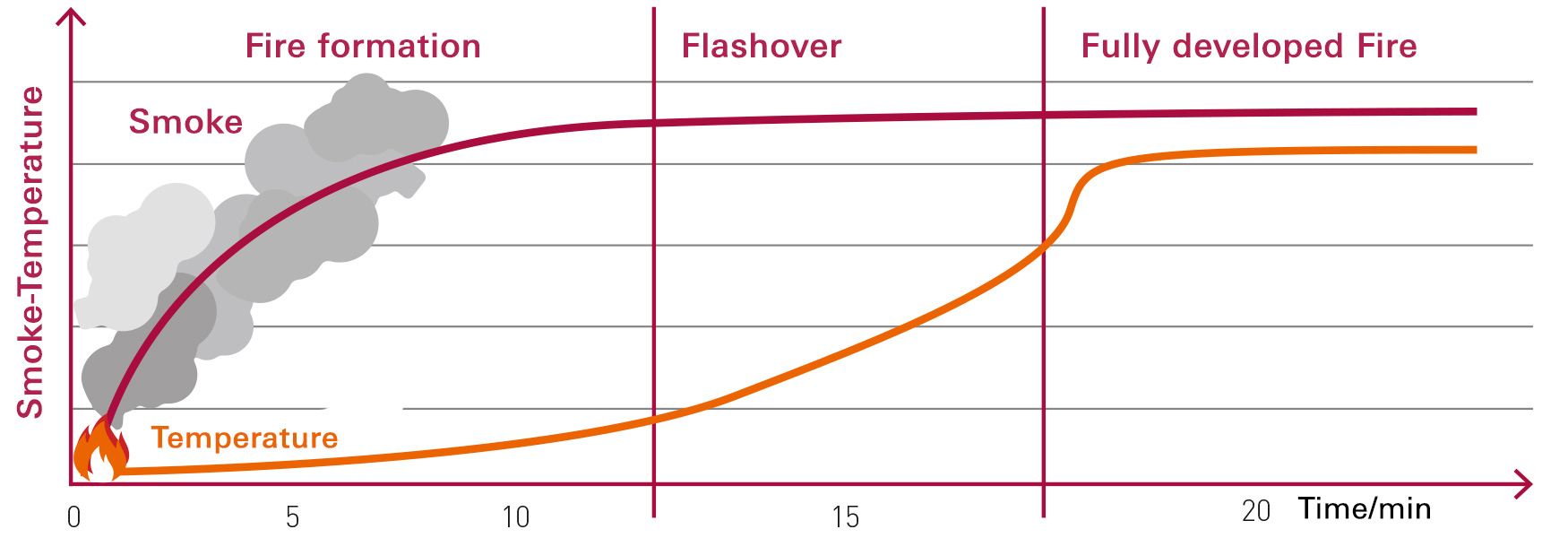 The majority of fire victims dies by suffocation! About 90 % of the fire victims die by inhaling the toxic fire-smoke-mixture, which usually reaches life-threatening concentrations after just two to four minutes. By the smoke, the fugitives can see nothing. Breathlessness, dizziness and vision disorders lead to disorientation and panic reactions. Fire smoke is a toxic mixture of gases, vapors and solids. The exact composition and quantity depends on the fire materials and fire conditions.