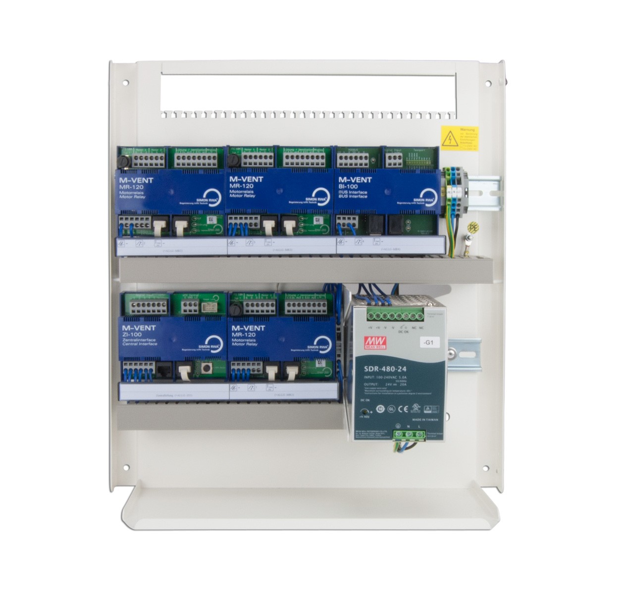 The respective ventilation groups can be set up and controlled flexibly. Each ventilation group has modules that react to the inputs and outputs and to the control commands. A switching power supply 230 V AC <> 24 V DC supplies power to the control panel. The expansion stages 5 A, 10 A, 20 A, 24 A, 48 A, 72 A are possible in steps of 24.