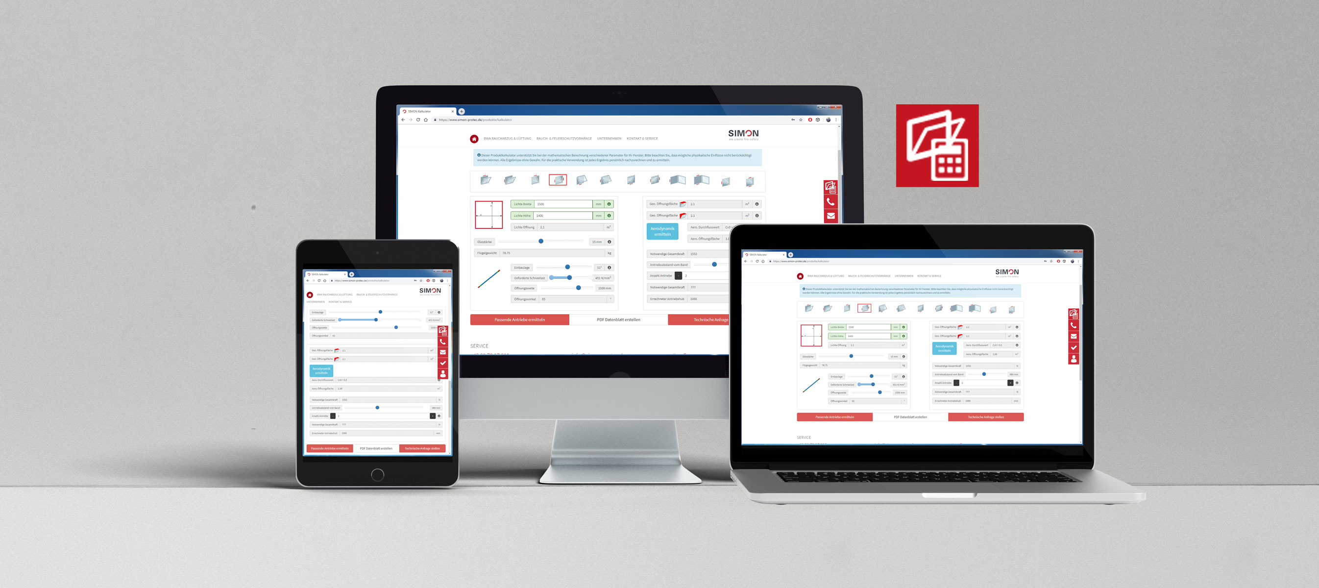 The SIMON Calculator is the new calculation tool which supports you in your daily work with natural smoke ventilation or controlled natural ventilation. Whether you want to get the parameters for an existing window or check which window size is allowed for a special actuator - the SIMON calculator provides you the approximated values.