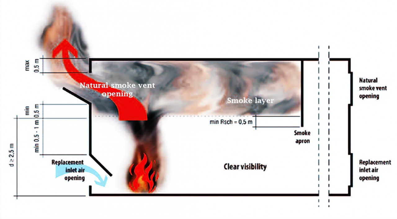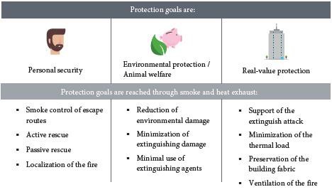 Active and passive rescue and evacuation of people as well as effective extinguishing work are massively impaired. Therefore, it must be a priority to remove the smoke as effectively and as fast as possible from the buildings or to limit it at least to a manageable range. The only way to remove fire smoke from buildings is either to extract it mechanically, i. e. with fans, or, which is much easier, to discharge it into the open air via existing building openings.